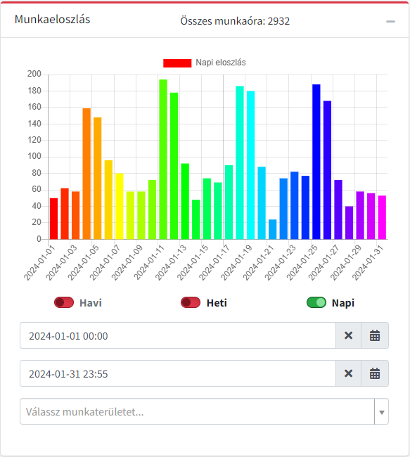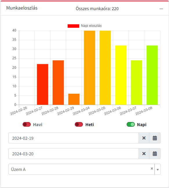 Az alkalmazás lehetőséget biztosít napi,heti és havi munkabér lekérdezésre, illetve bérelszámoláshoz szükséges adatok szolgáltatására is. A lekérdezett adatok kiexportálhatók xlsx, xls, csv, pdf, html formátumban, illetve egyszerű szövegként is.